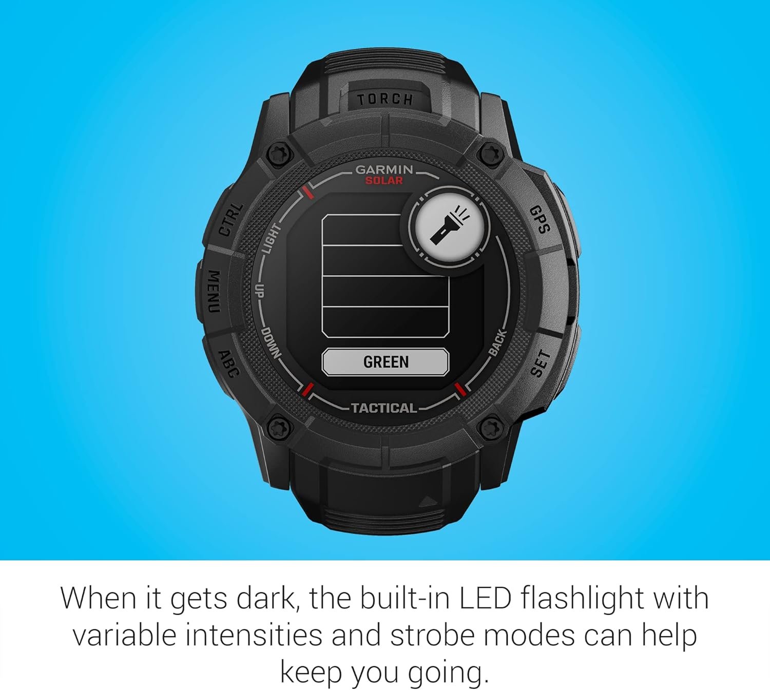 The Garmin Instinct 2X Solar Tactical is a rugged GPS smartwatch built to U.S. military standards for thermal, shock, and water resistance, designed for outdoor adventurers, tactical users, and serious athletes. It features solar charging for extended battery life, multi-band GNSS positioning, advanced health tracking, a built-in LED flashlight, and a ballistics calculator — making it one of the most capable outdoor smartwatches available.
